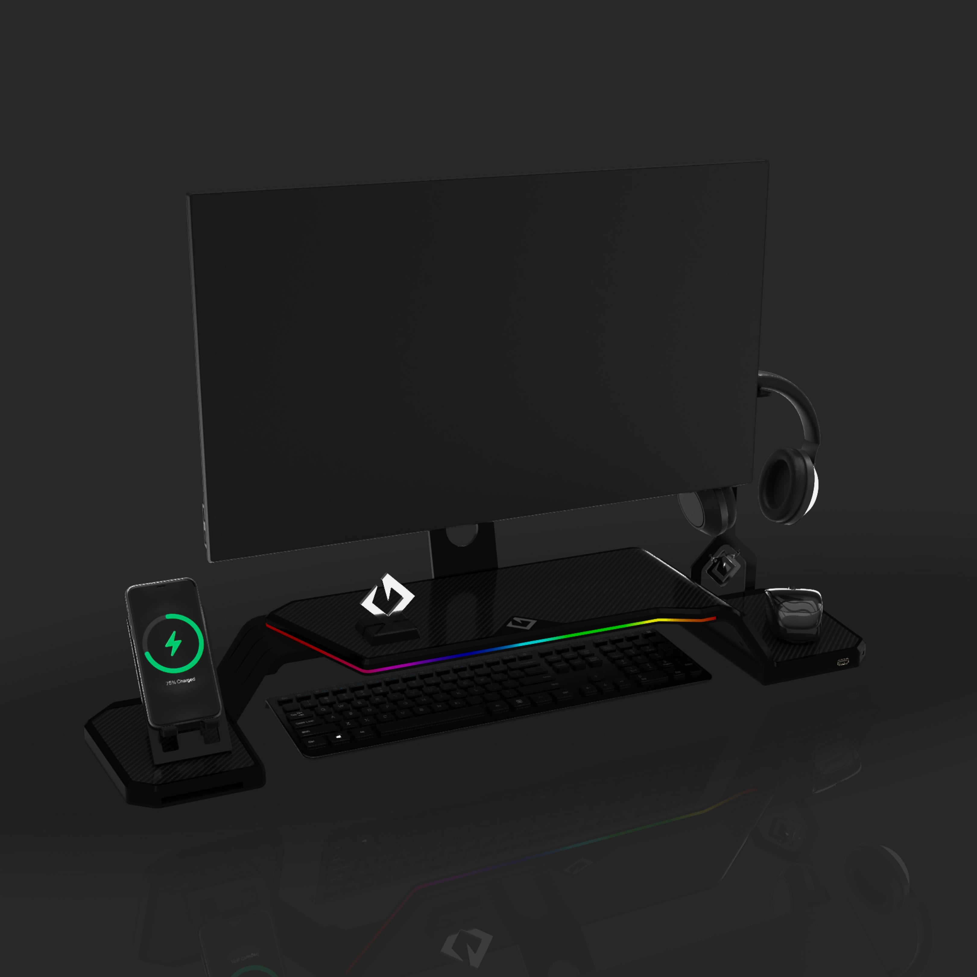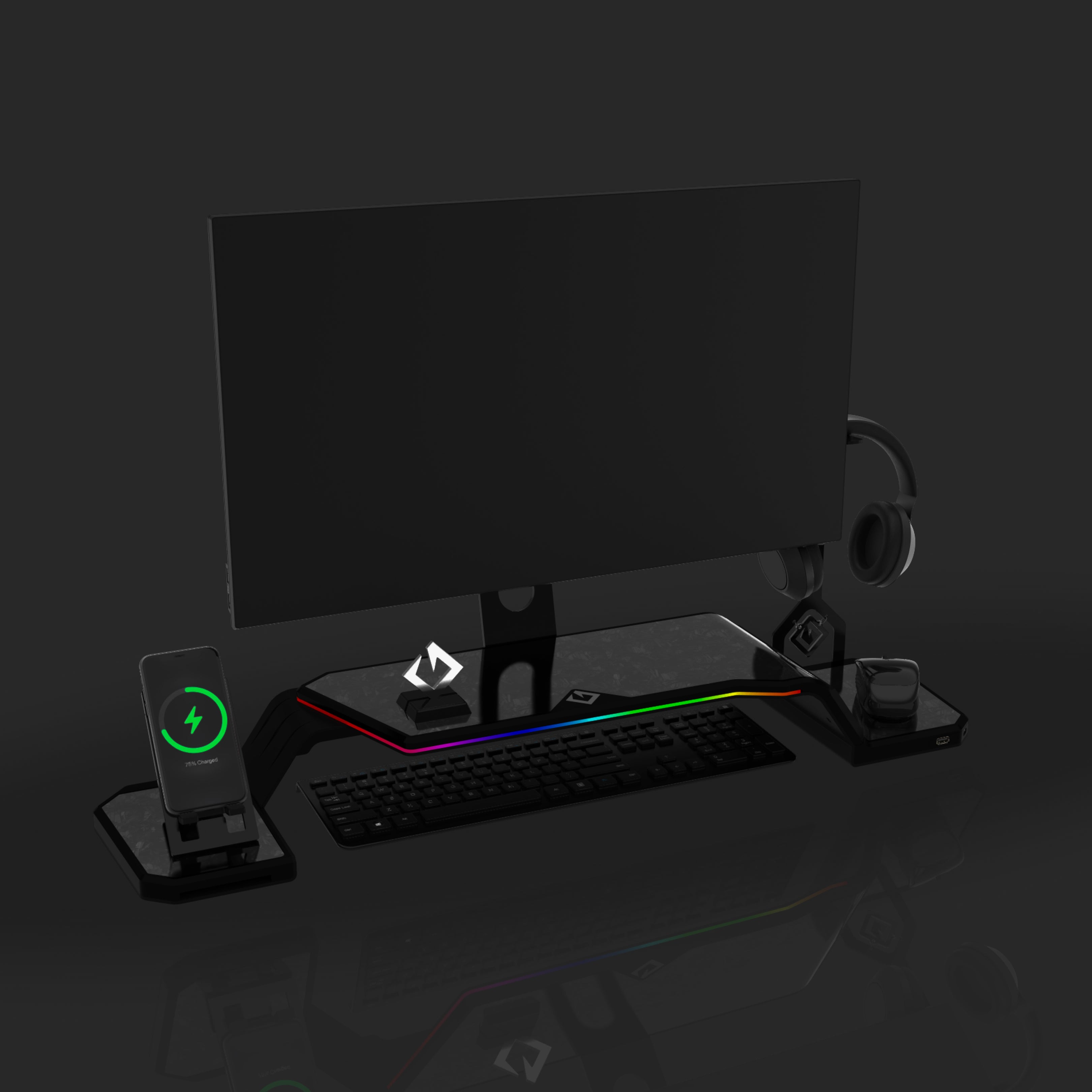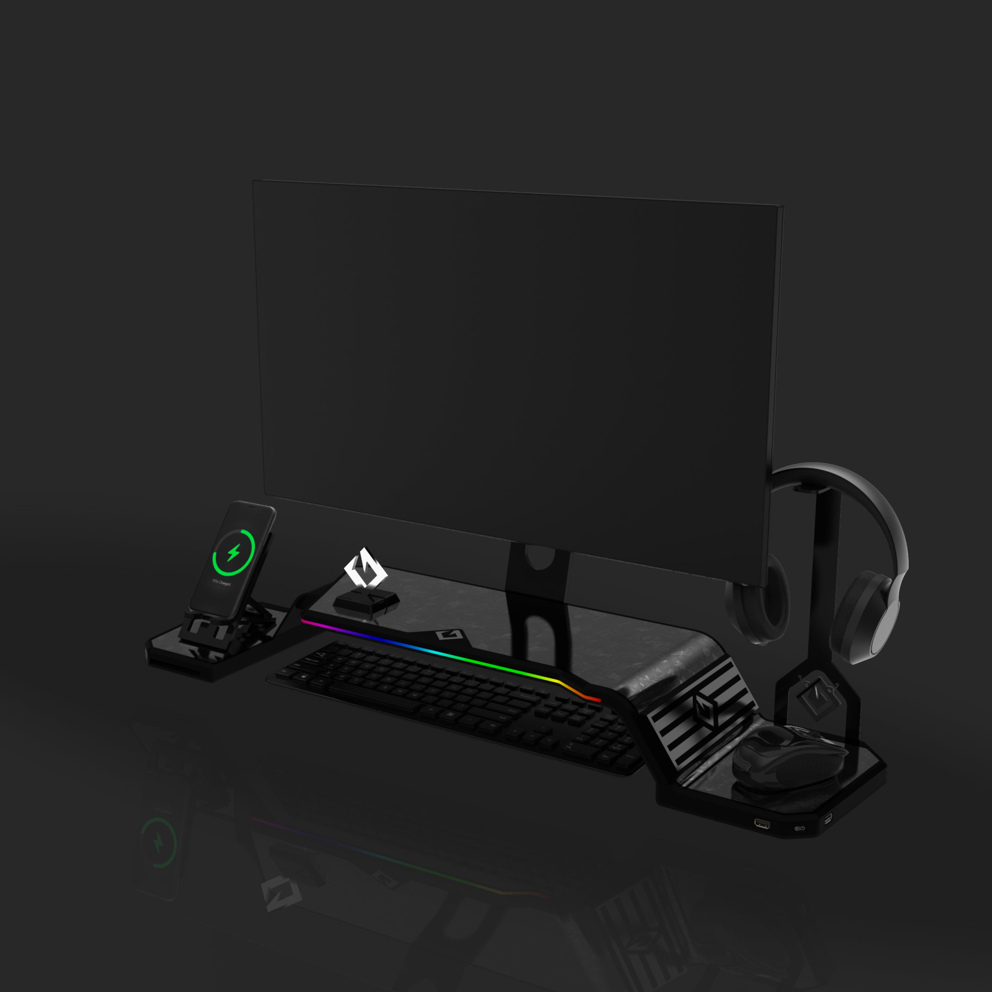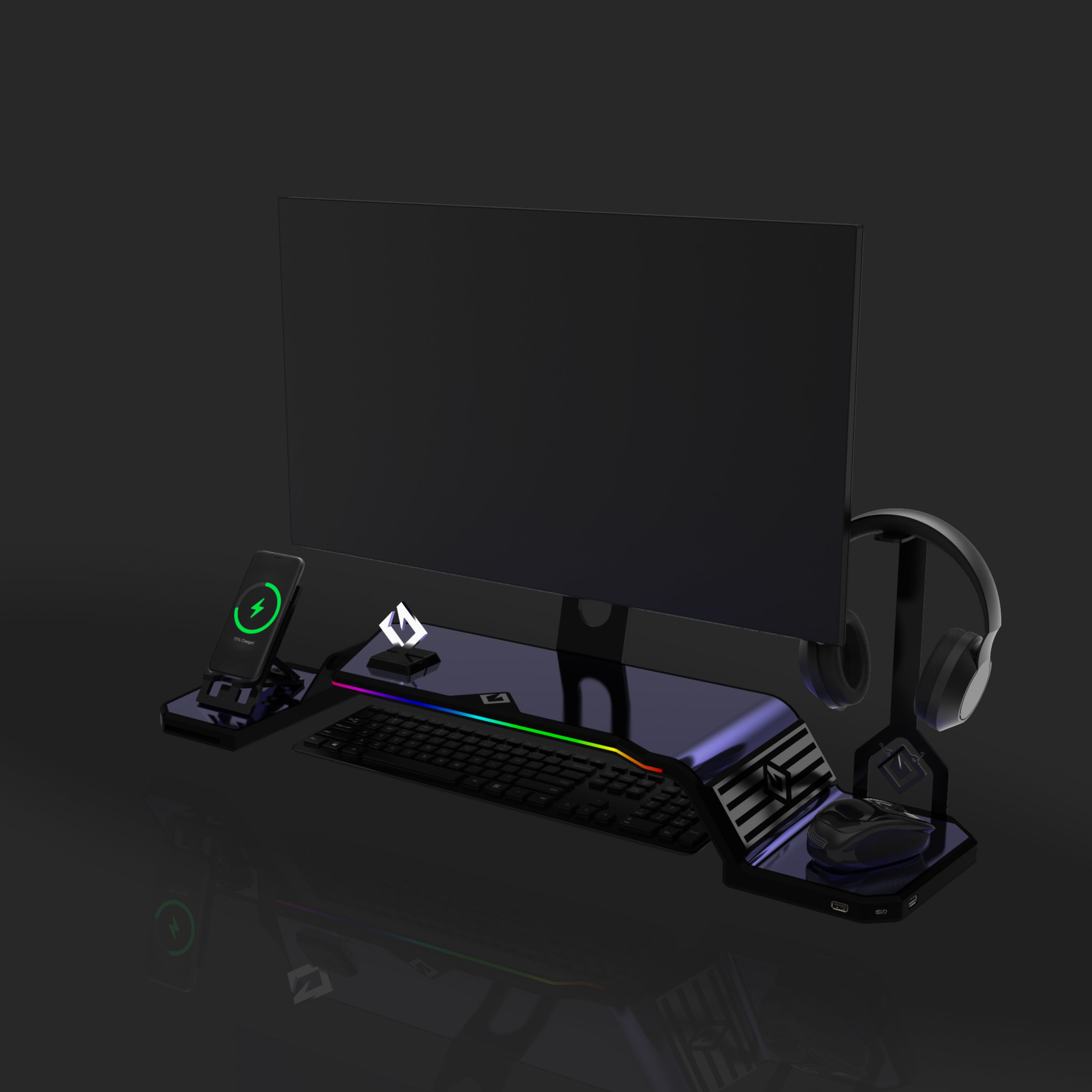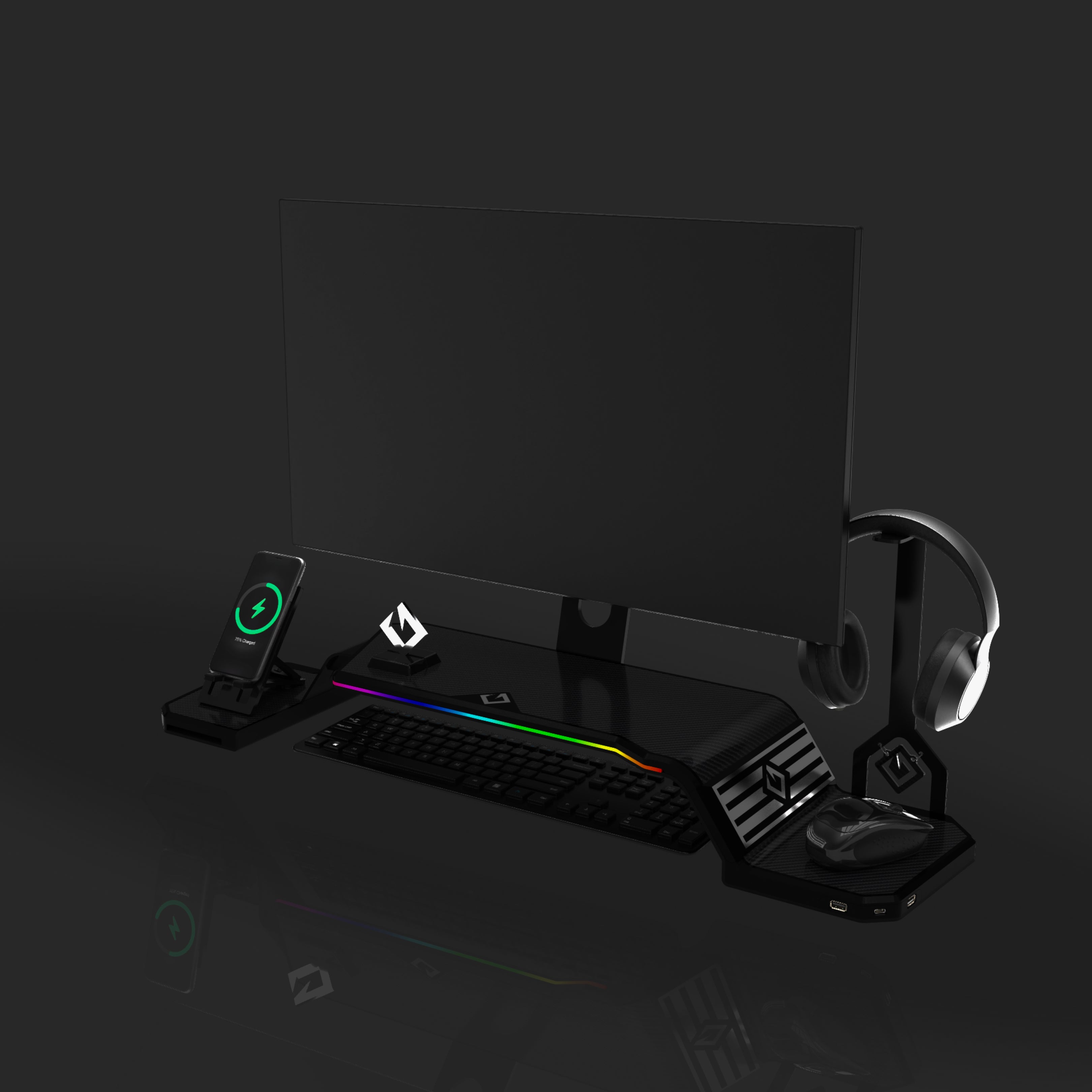 The ultimate monitor stand for desk to optimize your workspace. This desk monitor stand is equipped with a Headphone Stand, Foldable Phone Stand, and USB Hub (1× USB-C, 2× USB 3.0). Personalize your setup with customizable RGB lighting and ergonomic design, supporting VESA-compatible monitors from 17" to 32" (VESA 75×75mm and 100×100mm).