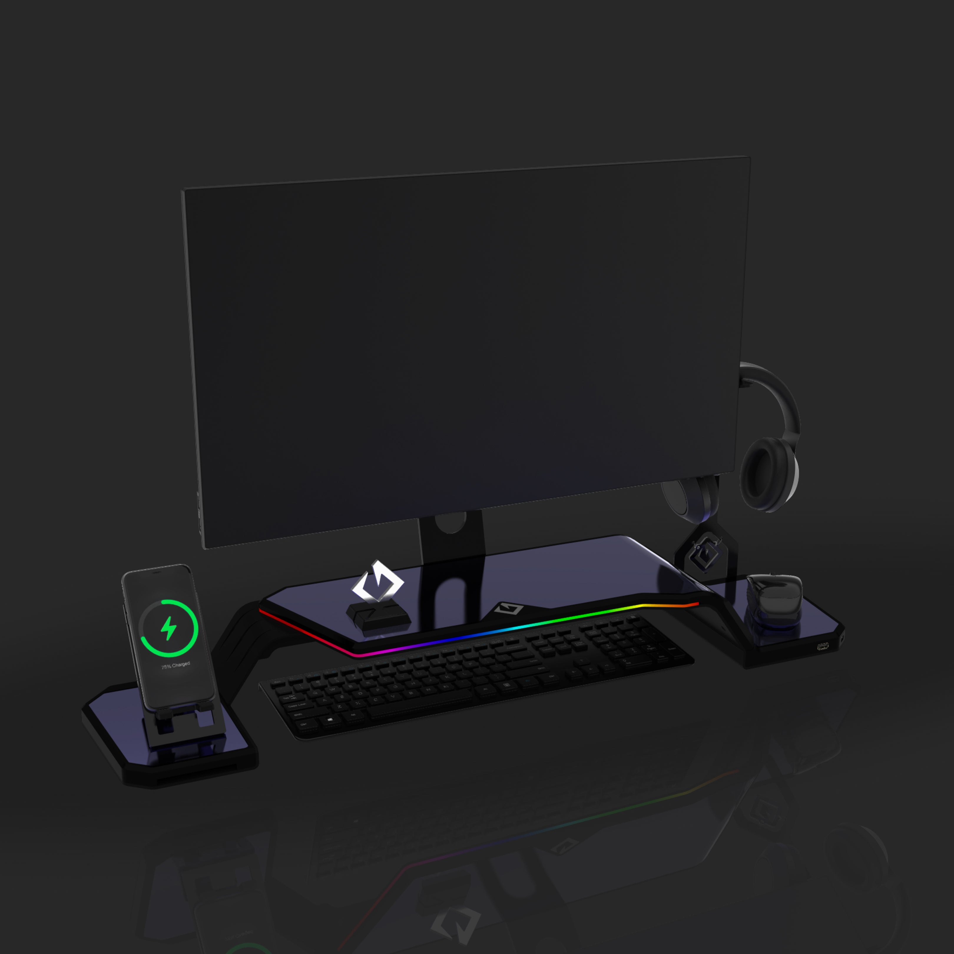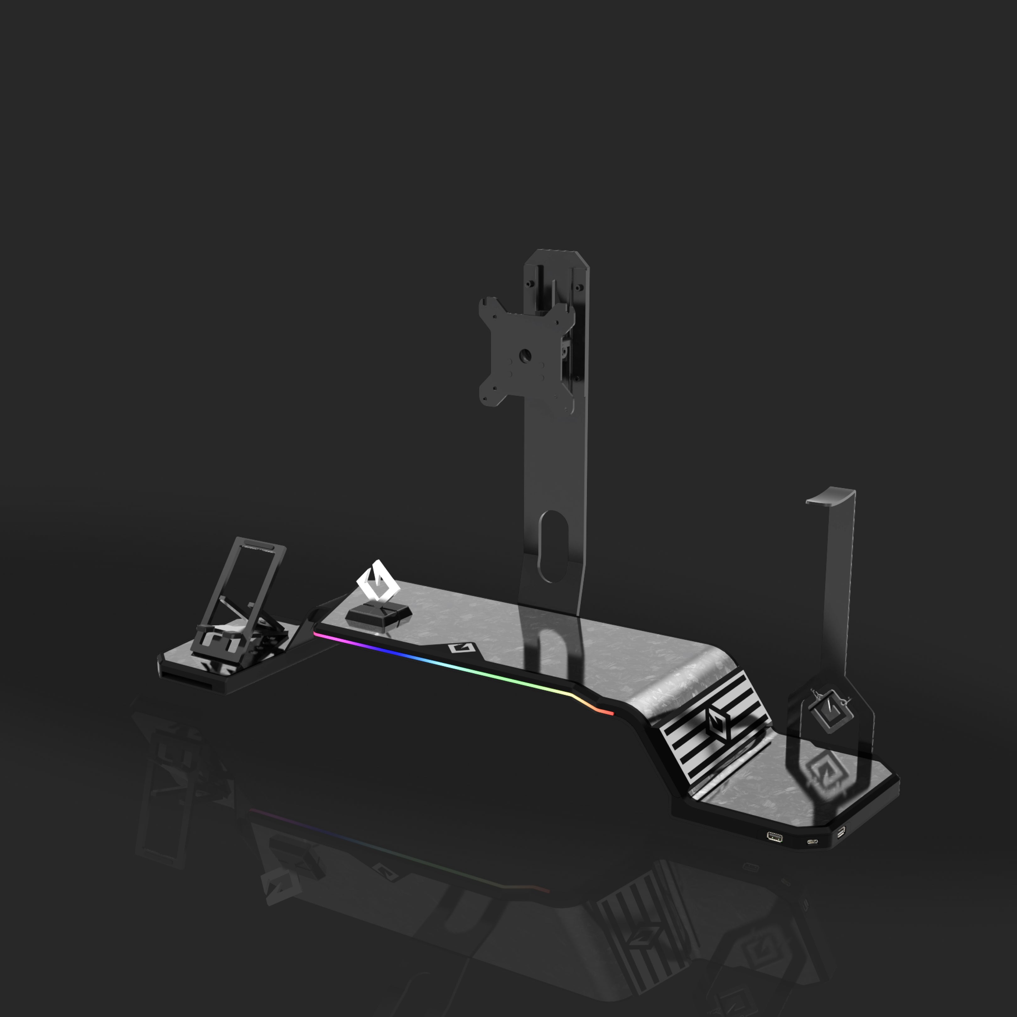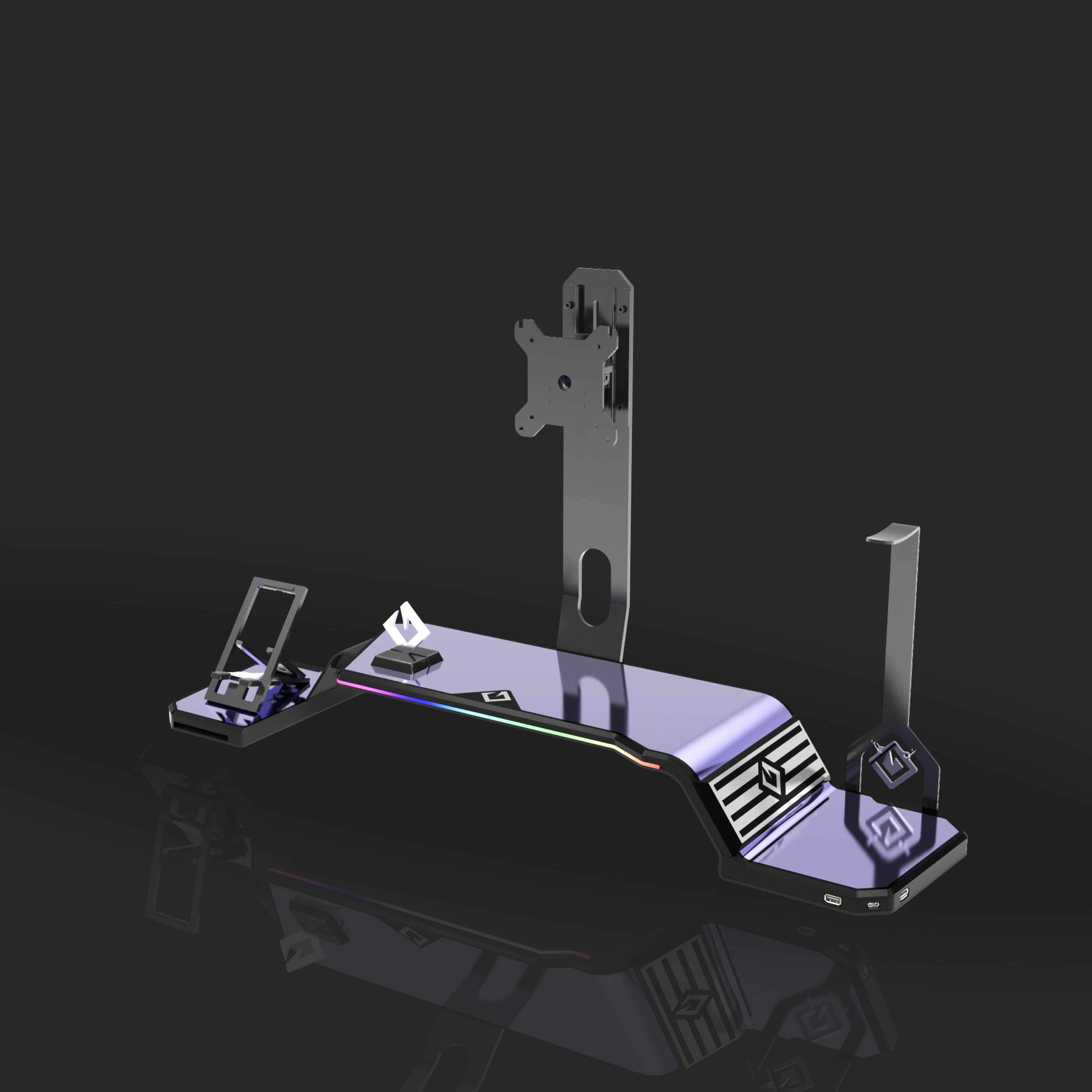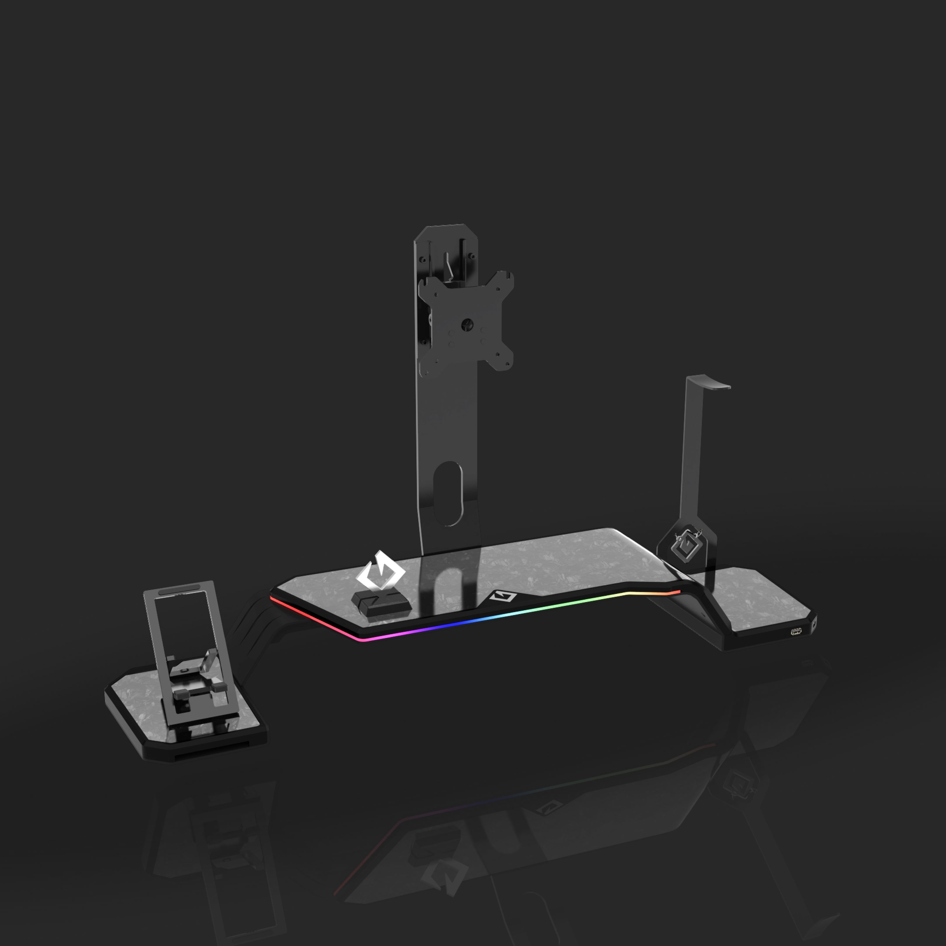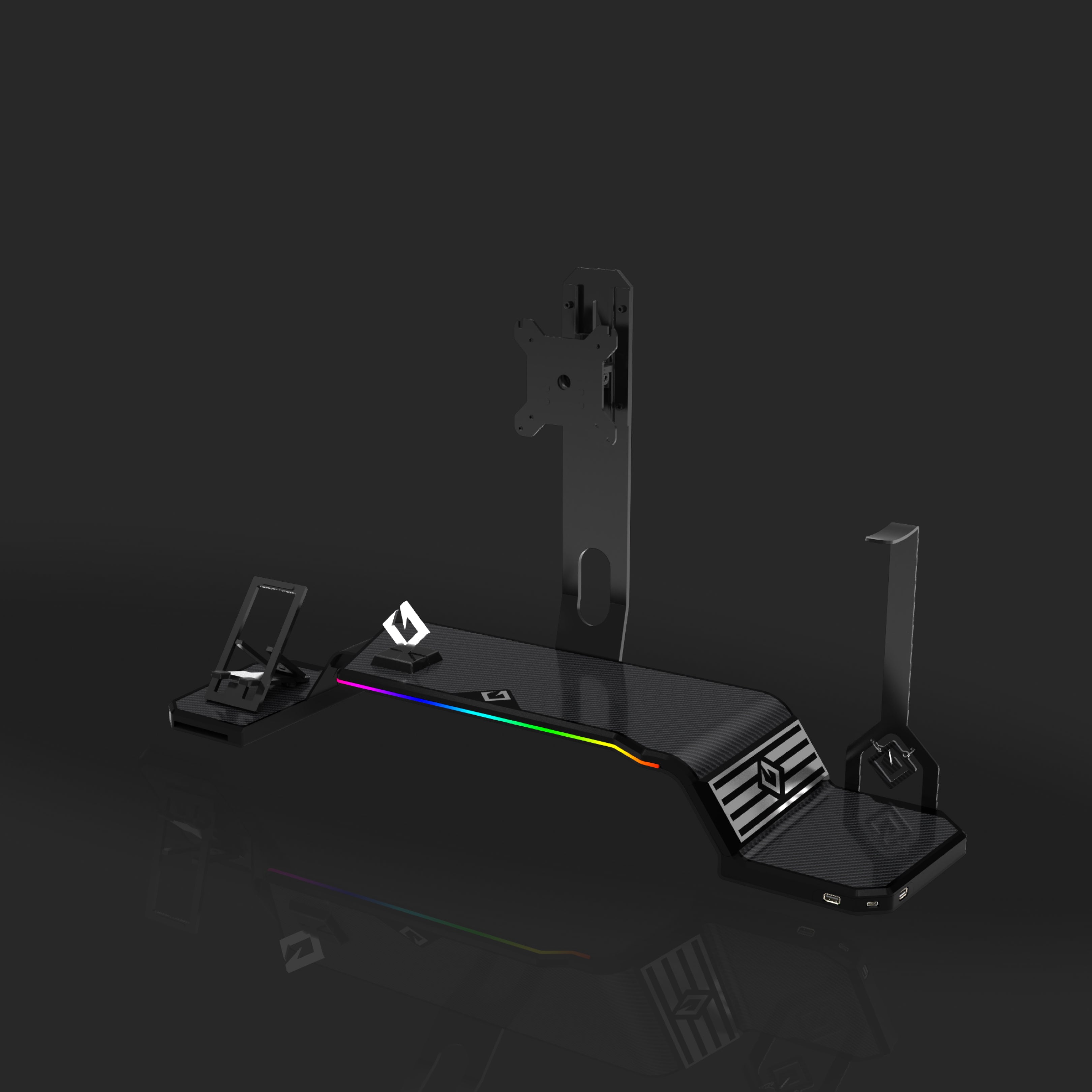 The ultimate monitor stand for desk to optimize your workspace. This desk monitor stand is equipped with a Headphone Stand, Foldable Phone Stand, and USB Hub (1× USB-C, 2× USB 3.0). Personalize your setup with customizable RGB lighting and ergonomic design, supporting VESA-compatible monitors from 17" to 32" (VESA 75×75mm and 100×100mm).