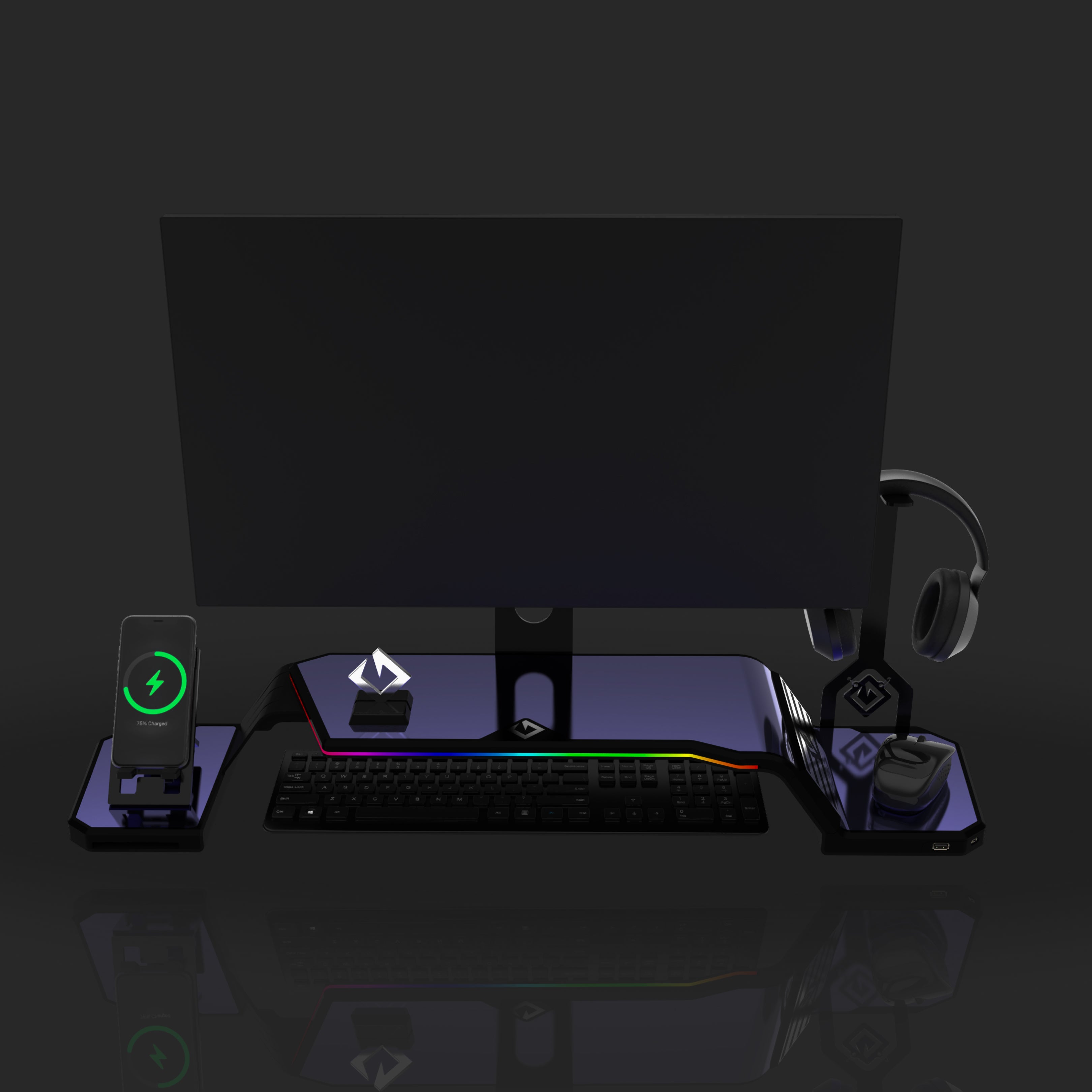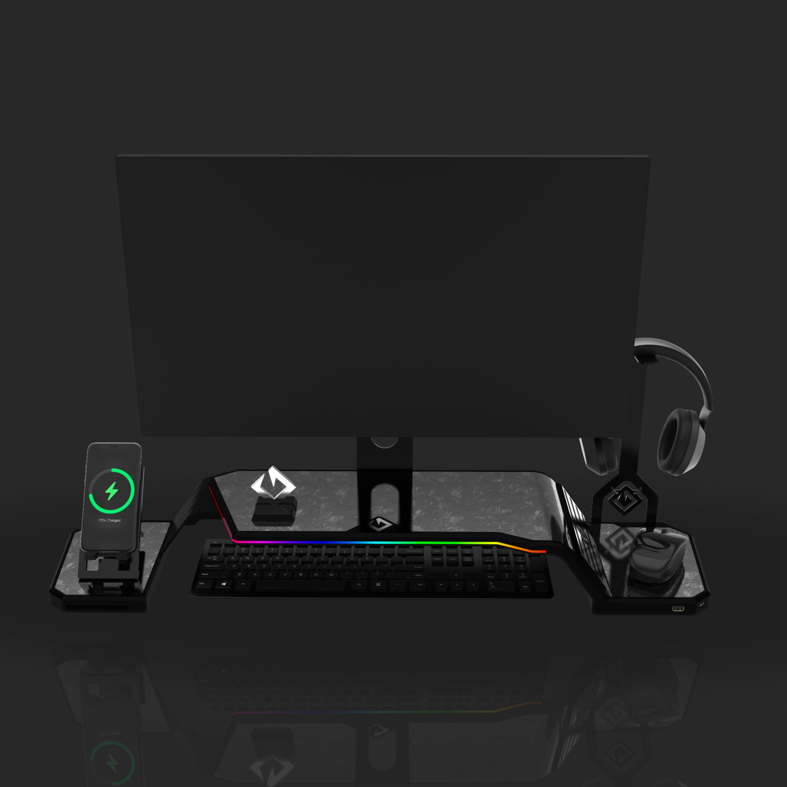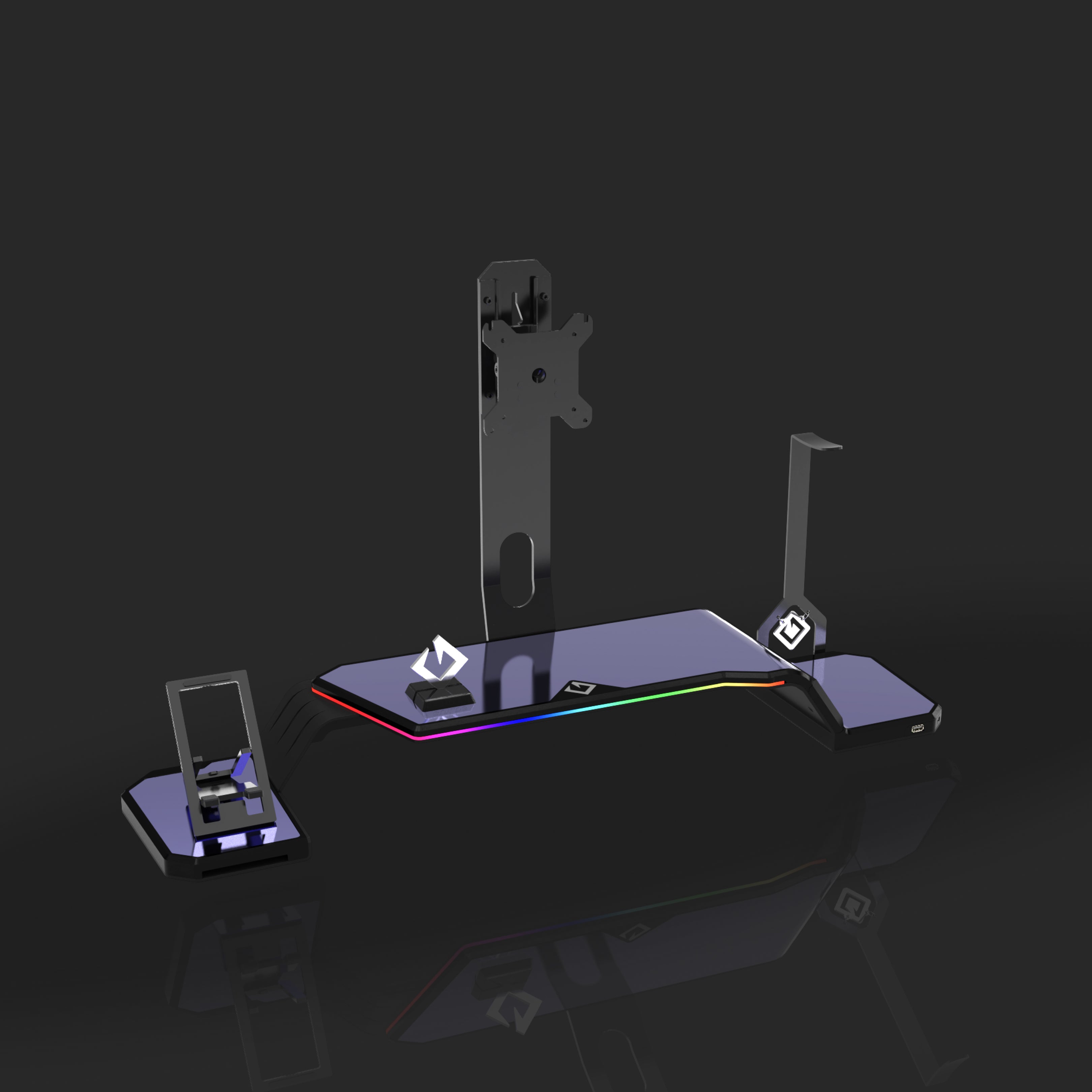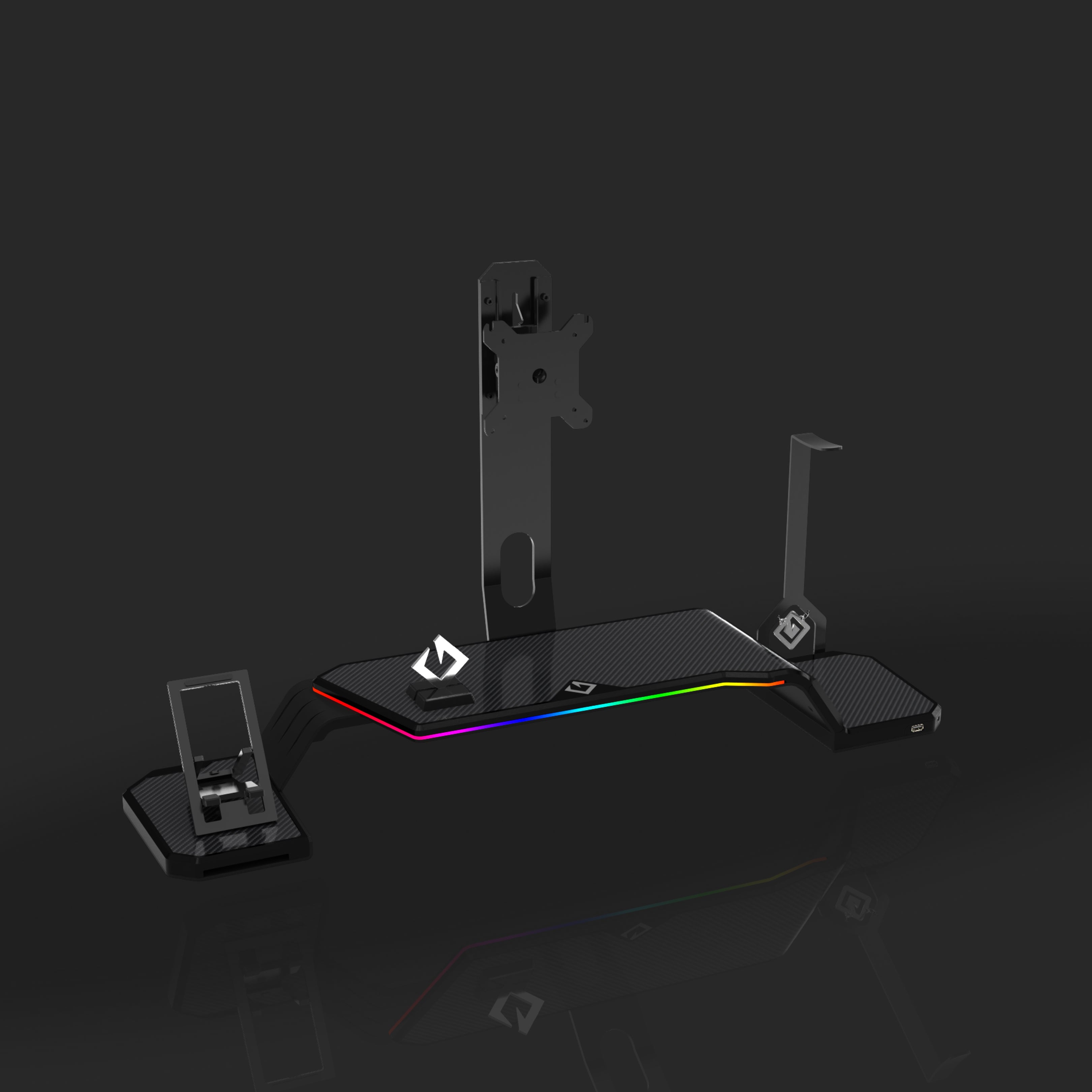 The ultimate monitor stand for desk to optimize your workspace. This desk monitor stand is equipped with a Headphone Stand, Foldable Phone Stand, and USB Hub (1× USB-C, 2× USB 3.0). Personalize your setup with customizable RGB lighting and ergonomic design, supporting VESA-compatible monitors from 17" to 32" (VESA 75×75mm and 100×100mm).