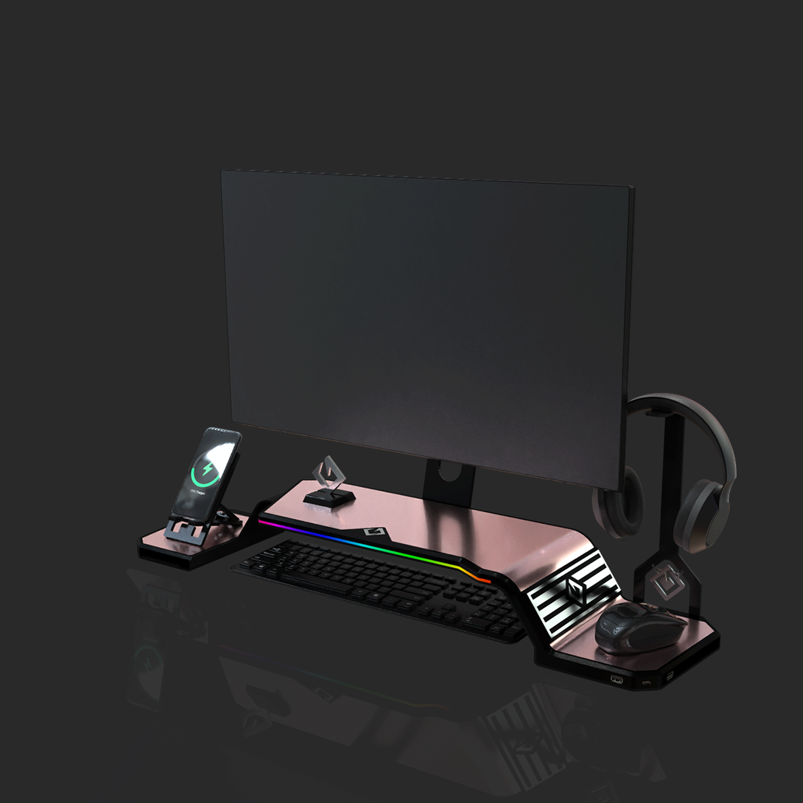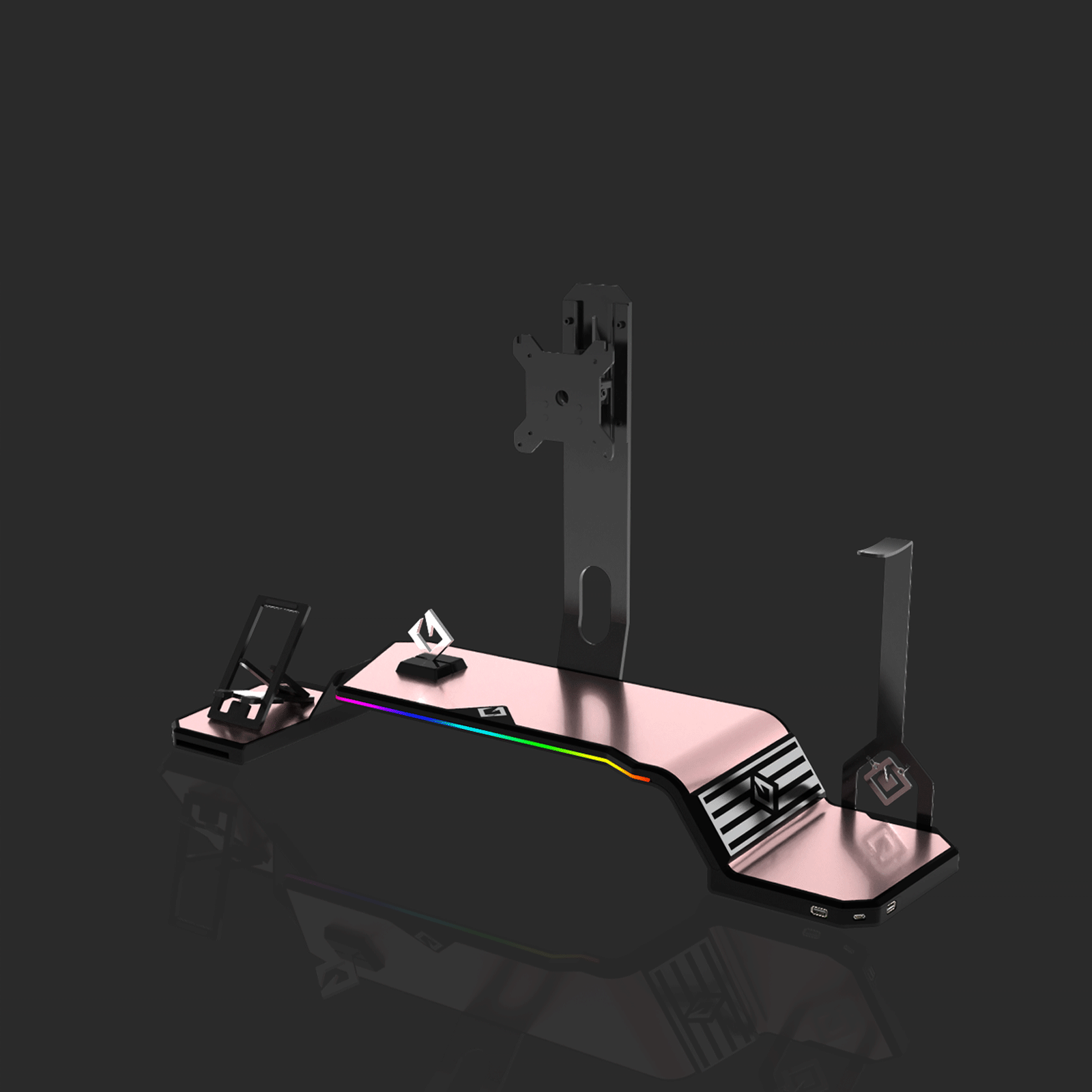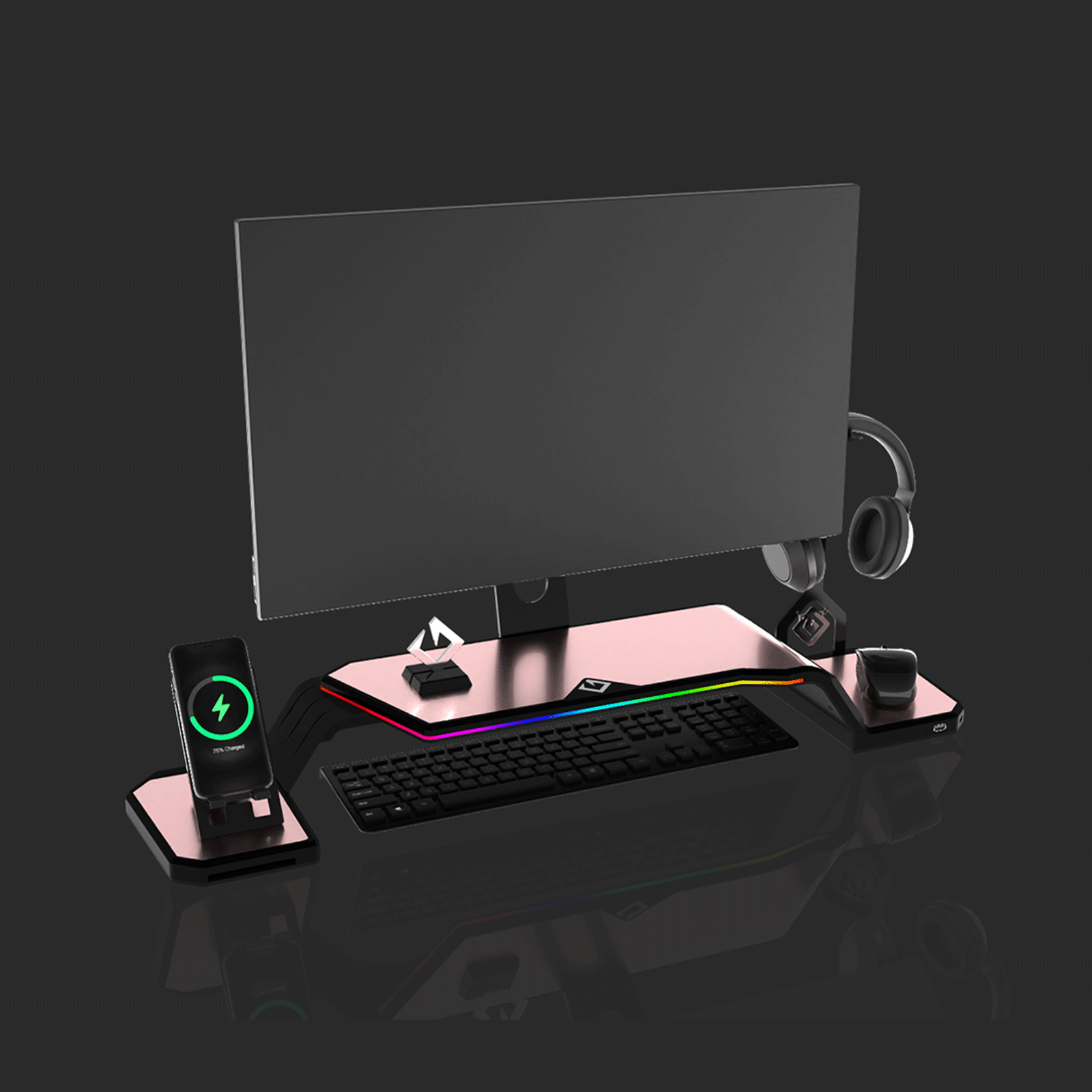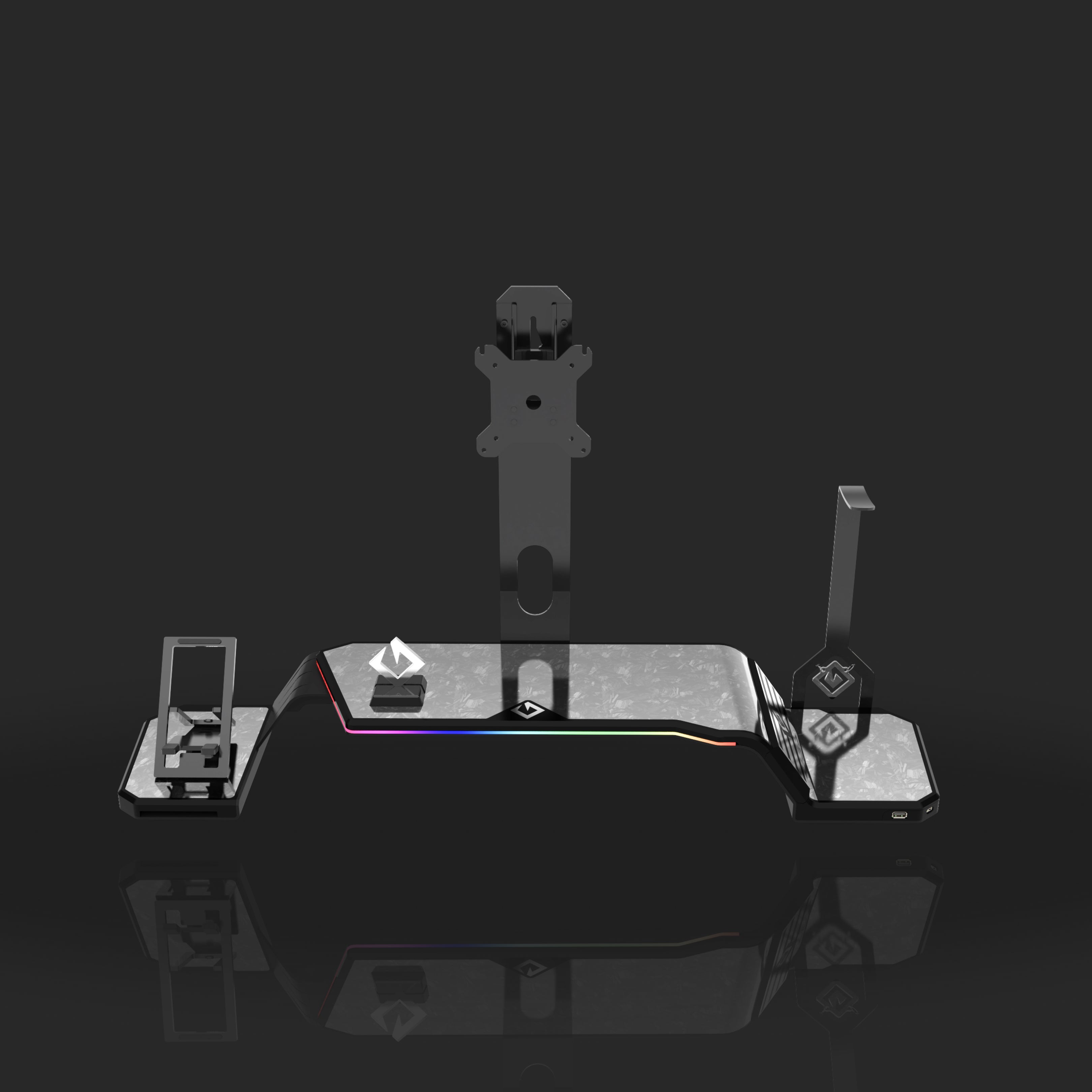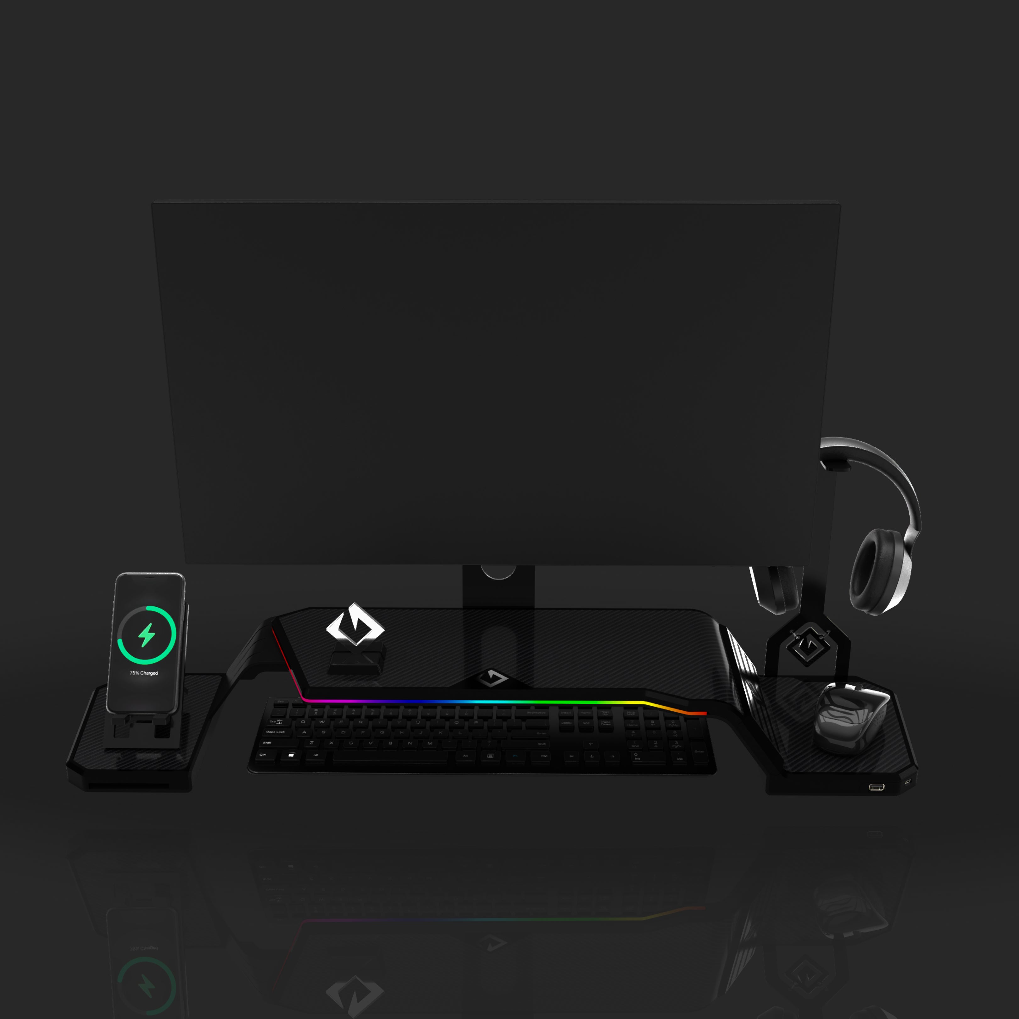 The ultimate monitor stand for desk to optimize your workspace. This desk monitor stand is equipped with a Headphone Stand, Foldable Phone Stand, and USB Hub (1× USB-C, 2× USB 3.0). Personalize your setup with customizable RGB lighting and ergonomic design, supporting VESA-compatible monitors from 17" to 32" (VESA 75×75mm and 100×100mm).